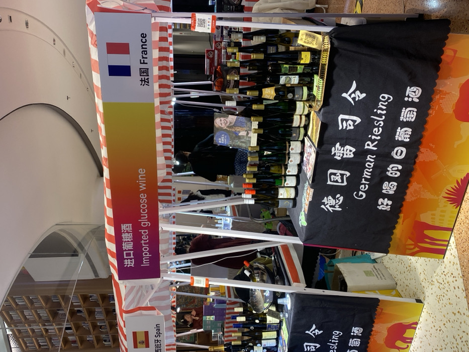 - "The image displays an indoor wine sales event featuring multiple market stalls under a red and white striped canopy, situated in the Haidian District, China" by FM-ETFCt1, licensed under CC BY 4.0