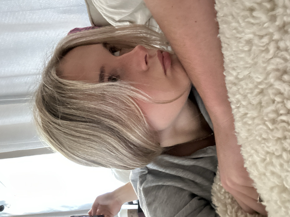 The image displays a young Caucasian female with shoulder-length blonde hair, lying prone on a textured, off-white fleecy surface. She is wearing a grey long-sleeved top and a thin necklace; a ring is visible on her left ring finger. Her head rests on her right forearm, and she gazes towards the right side of the frame with a neutral expression. Her left hand holds a dark-colored smartphone, indicating interaction with the device. Partially visible behind her left arm is a white drink container with a dark lid. The background shows white sheer curtains, suggesting a window, and a light-colored piece of furniture. The interior space is brightly lit by natural light. The specific location within Kingston, Canada, is not discernible from the visual information provided.