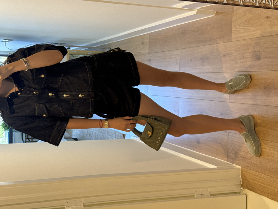 An individual, presumed female, is depicted taking a mirror selfie in a hallway within the city of Miami Beach, United States of America. The subject is partially visible, with her face obscured by a light-colored smartphone held in her raised right hand. She is wearing a dark blue short-sleeved denim shirt featuring gold buttons and four chest pockets, paired with dark blue denim shorts. On her feet are light grey suede loafers; the left shoe exhibits a silver buckle, and the right shoe a silver zipper pull. In her left hand, she holds a small, olive green quilted Chanel handbag with a gold interlocking C logo clasp. Accessories include a gold wristwatch and a red string bracelet on her left wrist, multiple silver bracelets on her right wrist, and a silver necklace. The immediate environment consists of light brown wooden flooring, white painted walls with matching baseboards, and a white door with a visible silver hinge to the left. A decorative mirror frame is partially reflected on the right side of the image. The background, visible through a doorway, is blurred and suggests an interior space containing greenery.