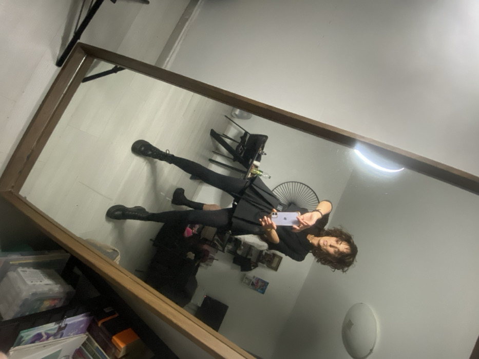 An adult female is captured in a mirror selfie taken within a room in Bat Yam, Israel. The subject has curly, dark hair and is dressed in a black long-sleeved top or blazer, a black pleated skirt, black tights, and black platform lace-up boots. A gold-colored necklace is visible around her neck. She holds a light purple mobile phone with both hands, extending her arms forward to photograph her reflection in a large, vertical, brown wooden-framed mirror. The reflected environment reveals a room with white walls and a light-colored floor. A circular flush-mount ceiling light fixture is visible on the ceiling. To the subject's left in the reflection, a black-backed chair and part of a table with a green bottle are visible, along with a partial black tripod stand. Behind her, another person's lower legs, also wearing black clothing and shoes, are partially visible. Further into the room, a dark-colored sofa is present. Above the sofa, a television screen is mounted on the wall, and shelving displays various items including books and boxes. A large, circular, spoked decorative object is mounted on the wall behind the subject's head.
