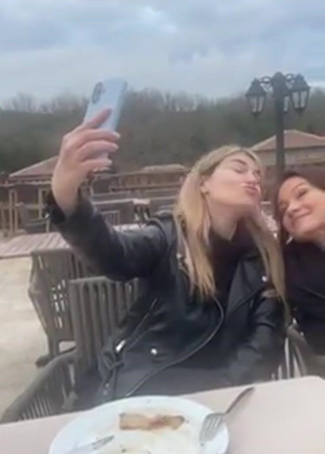 two women sitting at a table on a patio of a restaurant or cafe. The woman on the left is taking a selfie with a light blue phone. She has blonde hair and is wearing a black leather jacket. The woman on the right has darker hair and is also wearing a dark jacket. They are both smiling. There are plates with leftover food on the table, and silverware next to the plates. Other tables and chairs are visible on the patio in the background. There are trees in the distance, and the sky is overcast.