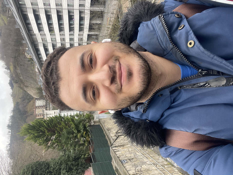 A male individual, appearing to be in his late 20s or early 30s, is centered in a close-up selfie, smiling directly at the camera