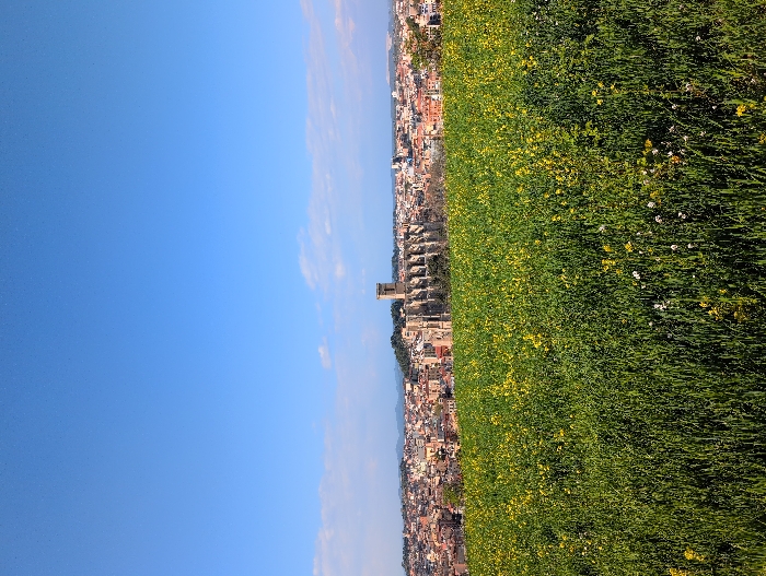 A wide-angle landscape photograph captures a panoramic view of Manresa, Spain. The foreground is occupied by a field of green vegetation, predominantly grasses, interspersed with numerous yellow flowers and a few white blossoms. In the midground, the city of Manresa stretches across the frame, characterized by dense residential and commercial structures with terracotta and red-tiled roofs. Dominating the cityscape, centrally positioned and elevated, is the Basílica de Santa Maria de la Seu, a large Gothic-style church featuring a prominent square bell tower and buttresses along its visible side. The background consists of a clear, bright blue sky with sparse, horizontally aligned white cumulus clouds along the distant horizon. No individuals or specific interactions are visible within the scene.