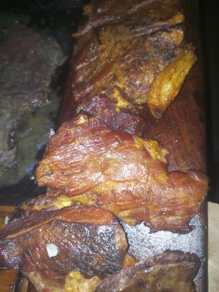 Assorted cuts of cooked meat are arranged on a wooden board. Some pieces appear more charred, while others have a lighter, golden-brown color. The meat texture suggests it might be brisket or a similar slow-cooked cut. There are visible fat marbling and caramelized surfaces, indicating rich flavor and juiciness. Some pieces are glistening, likely from rendered fat. A dark area beside the wooden board might indicate additional meat or a side dish.
