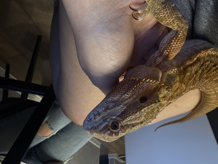 - "In an indoor setting in Yakhroma, Russia, a bearded dragon with orange and brown scaly skin and prominent spikes is positioned on the bare upper thigh and hand of an individual, whose hand is partially covered by grey fabric" by FM-GnXsE3, licensed under CC BY 4.0