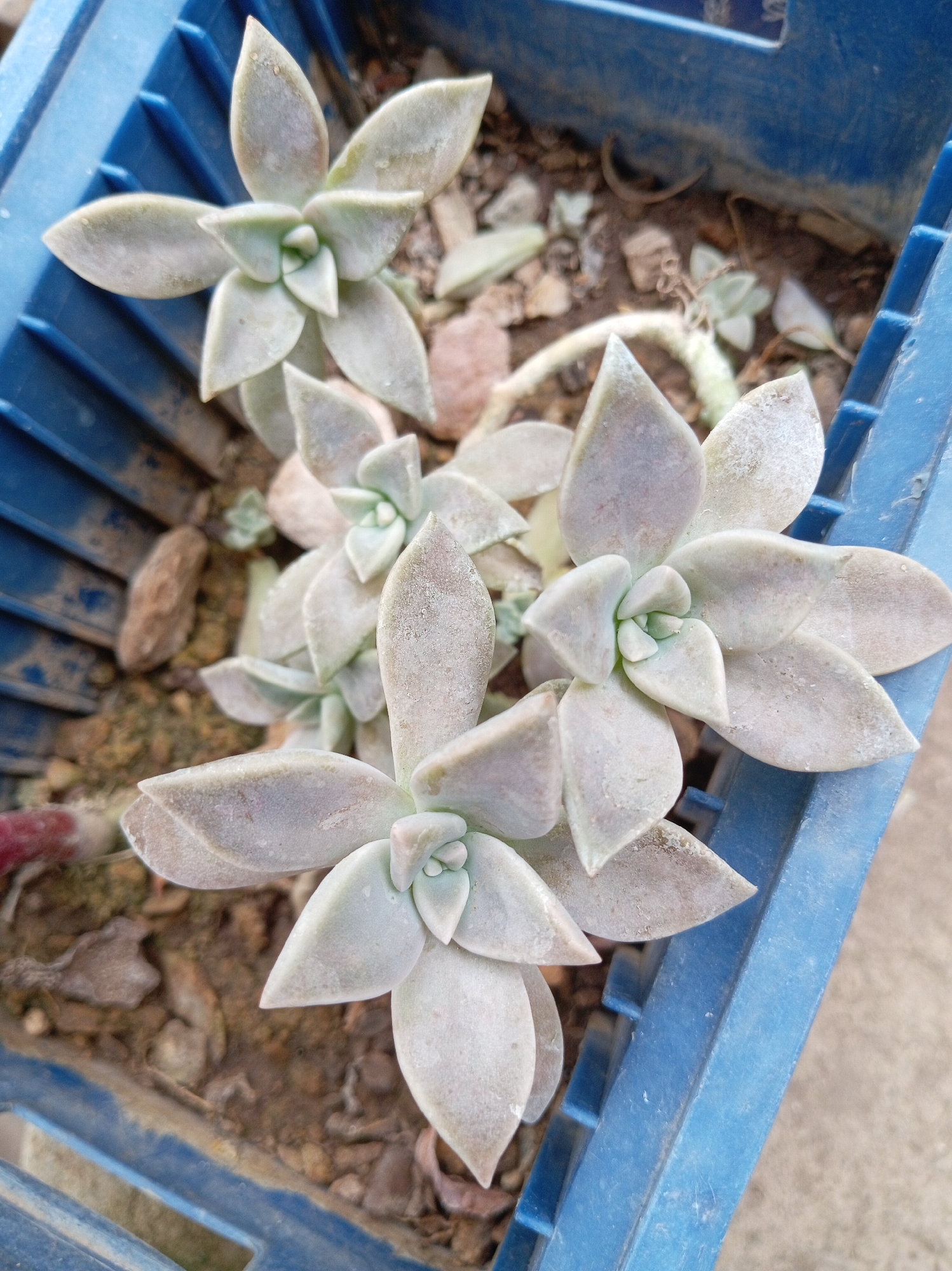 A close-up, angled shot features a cluster of succulent plants inside a blue plastic crate. The succulents are light gray-green with a powdery appearance, arranged with rosettes of leaves. The potting soil is visible between the plants and is a mix of dark brown and light-colored rocky material. The crate's interior shows a ribbed structure with some dirt accumulation. The background is minimal, showing a concrete surface beside the crate. The location information is not detectable from the image.