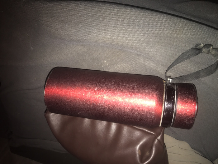 The scene is an indoor, static close-up, location identified as Unknown, Unknown. No individuals are present. The primary subject is a dark red cylindrical object, appearing to be an insulated bottle or thermos, resting horizontally on a dark gray textile surface. The object exhibits a speckled or glittered finish and reflects a prominent horizontal bright red light streak across its midsection. Its left end features a darker, possibly black, cap or collar with a thin metallic band. A black fabric strap, approximately 0.5 inches wide, is attached near this collar and extends downwards, terminating in a knot. The dark gray textile surface beneath the object shows a woven texture, consistent with upholstery. In the upper right background, a creased, dark brown material, resembling leather or faux leather, is partially visible, suggesting a cushion or furniture component. The lighting is dim, with a distinct light source illuminating the cylindrical object.