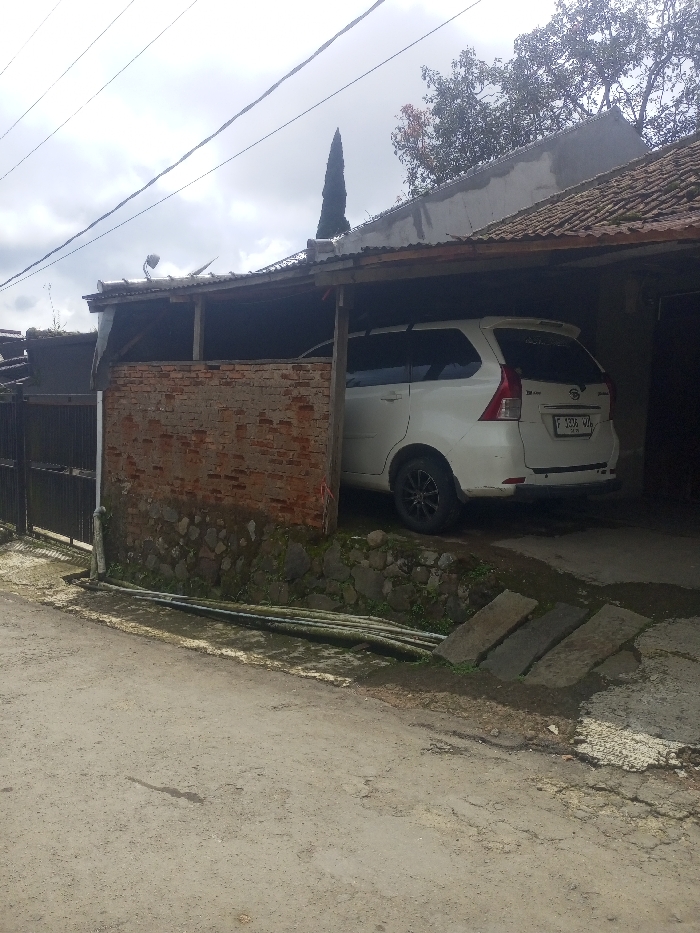 The image presents an outdoor scene in Ciherang, Indonesia, under an overcast sky. A packed dirt road, exhibiting minor surface wear and patches, occupies the foreground. To the right of the road, an elevated embankment is constructed with a base of irregular stones and an upper section of weathered red brickwork. A rudimentary carport structure, featuring wooden support posts and a corrugated metal roof, is situated atop this embankment. A white multi-purpose vehicle (MPV), identified as a Daihatsu Xenia or Toyota Avanza, is parked rear-facing within the carport. The vehicle's Indonesian license plate, "F 1336 WZ," is clearly visible. It is equipped with dark-tinted windows and dark multi-spoke wheels, with a spoiler mounted on the rear hatch. Above the carport, a light-colored fixture, possibly a security lamp, is attached to a support beam. Behind the carport, a residential building with a reddish-brown tiled roof is partially visible. To the left of the carport, a dark metal fence with vertical bars encloses an adjacent property. Several dark-colored pipes or conduits are laid horizontally on the ground beside the road, near the base of the embankment. Three rectangular concrete slabs are positioned to form a pedestrian crossing over a shallow depression, connecting the road to the raised embankment. Overhead utility lines traverse the upper portion of the frame against the pale, cloudy sky. In the background, a tall, slender coniferous tree stands prominently, accompanied by broader deciduous trees. No individuals are present in the scene.