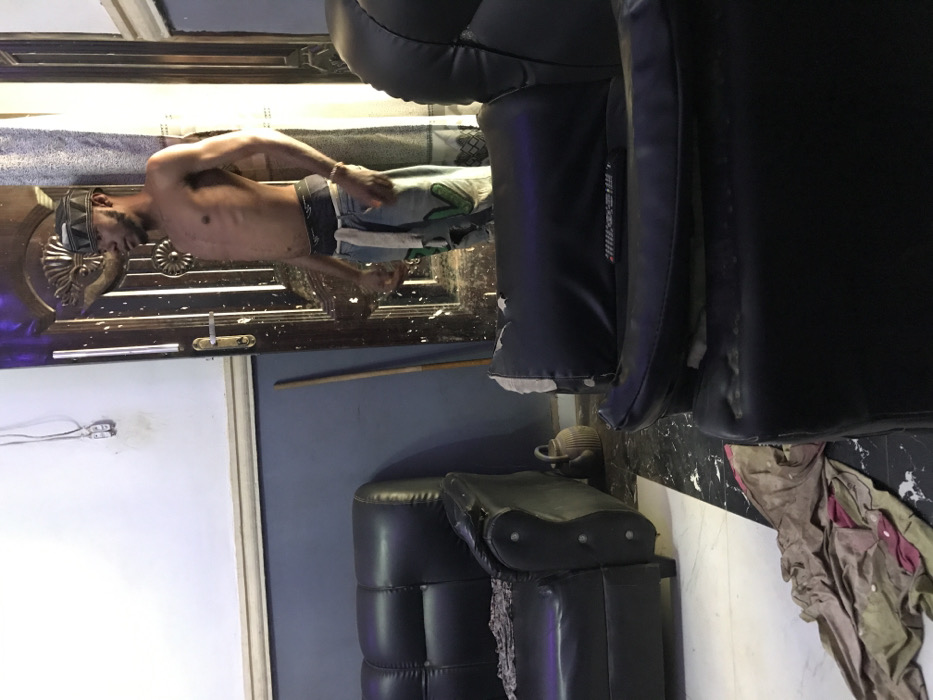 A shirtless man with a head covering stands near a door. A dark, damaged leather recliner and loveseat are visible in the foreground. A decorative teapot rests near the loveseat. Discarded fabric lies on the floor adjacent to the furniture. The setting is a room with a white and gray wall. A wooden rod leans against the gray wall.