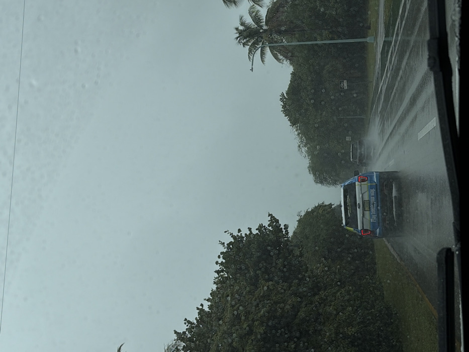 Raindrops dot a car window overlooking a wet road lined with lush greenery and palm trees