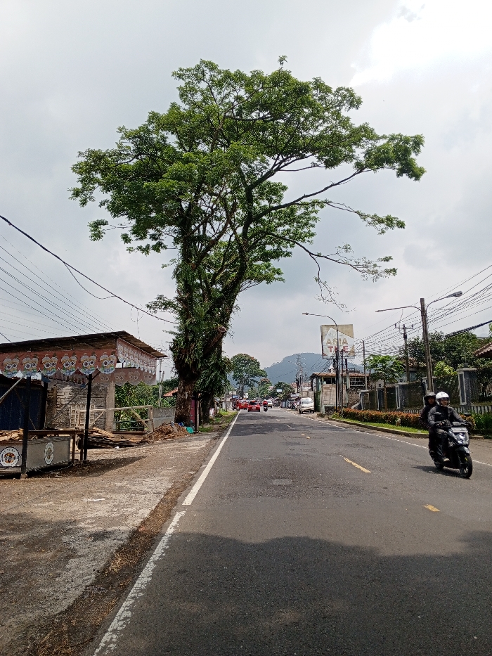 This image depicts a street scene in the city of Multhan, India, under an overcast sky. A large, mature tree with dense green foliage and a moss-covered trunk dominates the left side of the frame, extending high above the road. To the left of the tree, a building or stall with a dark roof is visible, featuring a white and orange banner adorned with repetitive circular motifs, possibly depicting stylized faces or owls. Utility poles and a network of overhead wires are present along the left side. The asphalt road, exhibiting visible wear, patches, and potholes, occupies the center and right side of the frame. A solid white line delineates the left edge of the road. In the immediate right foreground, a black scooter is traveling towards the viewer. The scooter carries two individuals; the driver wears a white helmet and dark jacket, while the passenger behind them wears dark clothing. Further down the road, in the midground and background, additional vehicles, primarily red cars, are visible traveling away from the camera. Buildings, fences, and dense green vegetation line both sides of the road. A prominent billboard, partially obscured and displaying the text "ASIA TAPE," is visible on the right side of the road. Streetlights and more utility infrastructure are present along the roadway. Green hills are visible in the distant background, partially obscured by atmospheric conditions.