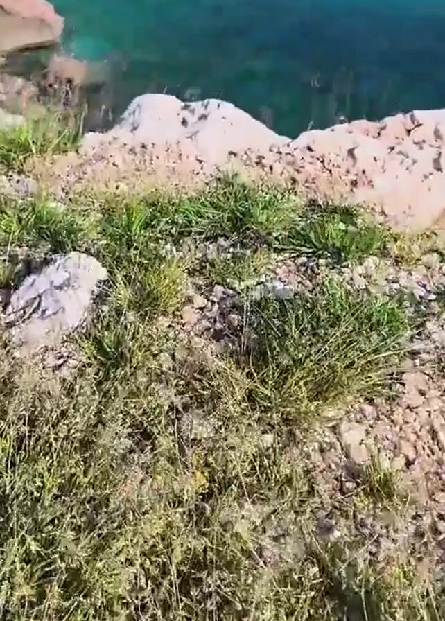 view from a rocky cliff overlooking a body of water. The water is clear and turquoise in color. The cliff is covered in rocks, grass, and some dirt. A smartphone sits on the ground amongst the rocks and grass in the lower part of the frame. The camera tilts upward to show a wider view of the water and the rocky shoreline.