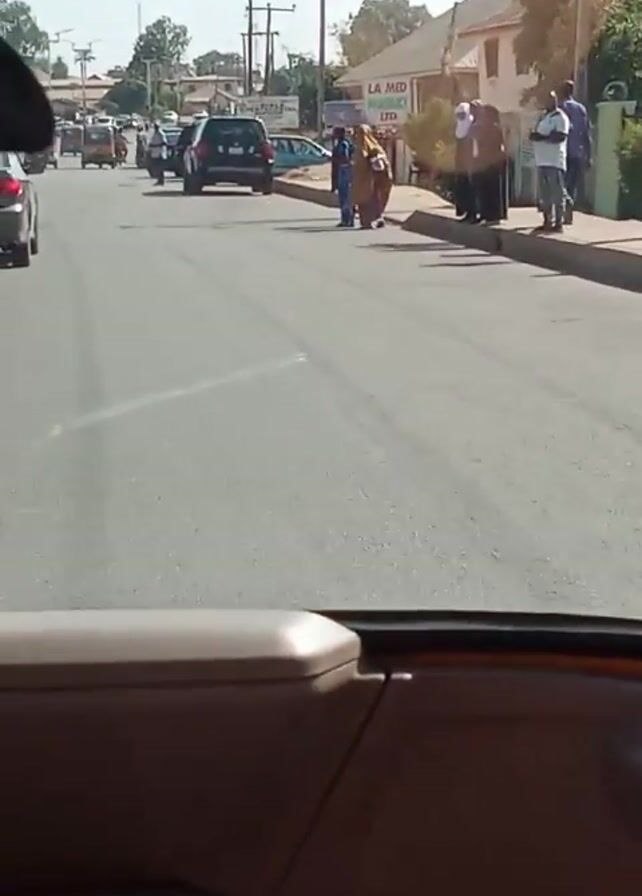 The video is shot from inside a motorized tricycle moving forward on a paved road in a daytime urban environment. In the foreground, the top of the tricycle's dashboard is visible. Through the windshield, a street scene unfolds. A black SUV is seen driving in the same direction as the tricycle. On the right side of the road, a group of people are standing on the sidewalk. Two women wearing traditional Muslim clothing are standing at the edge of the road, near where the SUV passed. Buildings line the street, and a sign for "LA MED PHARMACY LTD" is visible. Power lines stretch across the sky. Other vehicles, including cars and a smaller tricycle, are also visible in the distance. The video is slightly shaky and the focus shifts during the recording.