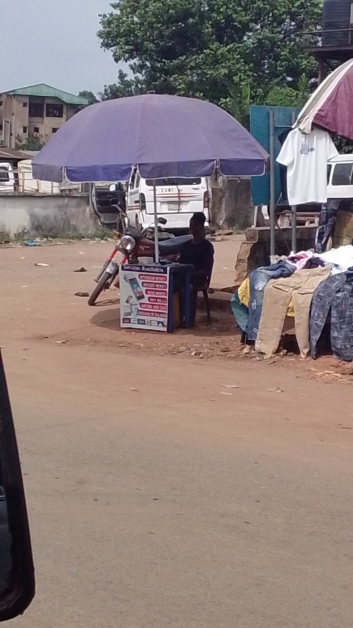 This image depicts a roadside commercial area in Igbo Ukwu, Nigeria, characterized by informal stalls and activity on an unpaved, reddish-brown dirt road under an overcast sky. In the midground, a large purple market umbrella dominates the left side, providing shade. Beneath it, a person, dressed in a dark top, is seated on a dark chair behind a small dark table. Adjacent to this person is a white rectangular sign with "Services Available" prominently displayed at the top, listing various financial or mobile services, accompanied by illustrations of a smartphone and a Point-of-Sale (POS) terminal. A red motorcycle is parked on its kickstand to the left of the umbrella. To the right, another market stall displays clothing. A white t-shirt hangs from a frame, and several pairs of trousers or jeans in different colors (including khaki, blue, and patterned) are laid out on a surface. Part of a striped maroon and white umbrella is visible above this stall. The background reveals a mix of urban elements: multiple white vans or buses are parked or moving, one showing "LUNT" on its rear. Further back, multi-story buildings with green roofs are partially visible through dense green foliage and trees. The foreground contains a dark, out-of-focus object, possibly a vehicle's side panel or mirror, suggesting the photograph was taken from a car.