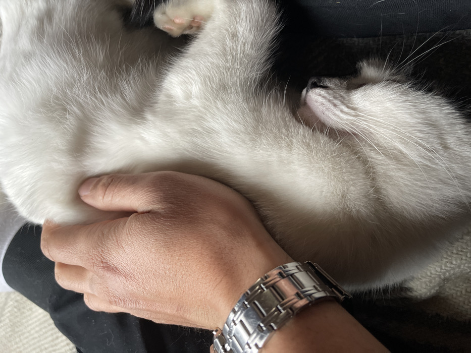 - "The scene, purportedly located in Lesidren, Bulgaria, depicts a close-up view of a human hand interacting with a white feline" by FM-pldVZ2, licensed under CC BY 4.0