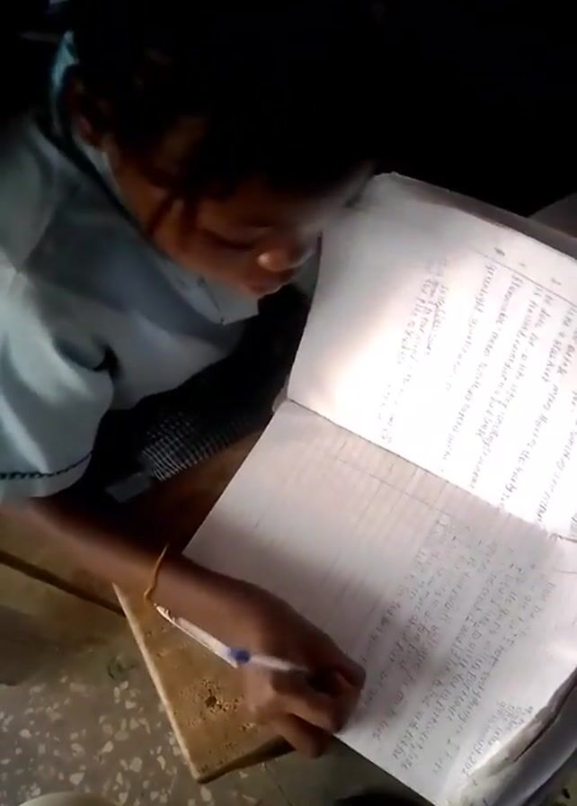 A person wearing a light blue collared shirt is writing in a notebook. The notebook is open and filled with writing. The person is sitting at a desk, and the area is dimly lit. The person’s head is bent toward the notebook as they write. A gold-colored bracelet is visible on their wrist. Other people are vaguely visible in the background.