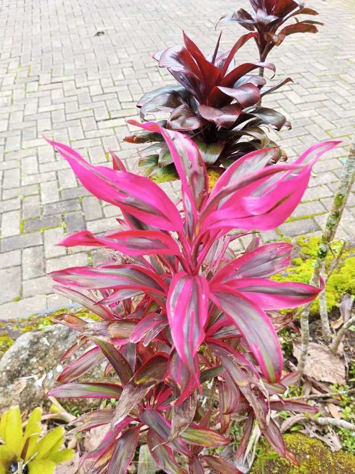 A vibrant Cordyline plant with striking pink and green striped leaves dominates the foreground. Behind it, darker red-toned Cordyline plants add depth. The plants grow in a natural setting with moss-covered rocks and scattered leaves. The background is paved with interlocking rectangular stones. A small green plant appears on the left side of the scene.