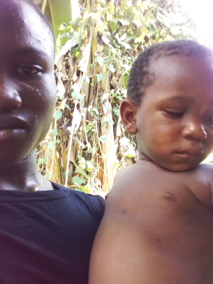 A person with dark skin wearing a dark blue shirt is holding a baby with dark skin. The baby is shirtless. Behind them are green and brown plants. Both the person and the baby are looking to the right. The person appears sweaty. The baby has a serious expression.