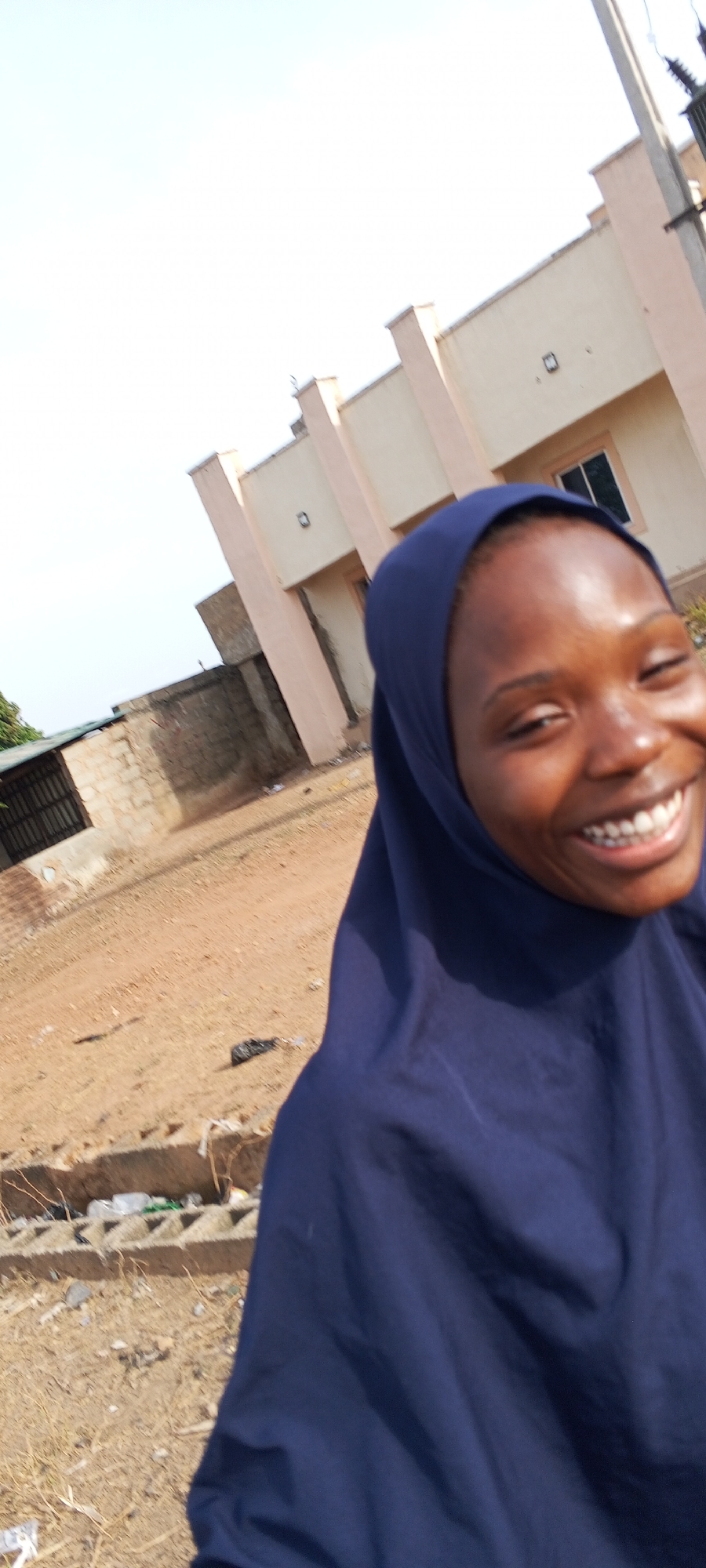 A smiling woman in a dark blue hijab is the primary subject of the image. The setting appears to be in a residential area, possibly in Keffi, Nigeria, given the prompt. The background shows a beige two-story building with column-like supports, a window, and a small square fixture. To the left of the building is a brick structure. The foreground consists of a dirt-covered area with some scattered trash near a concrete drain. The sky is visible in the upper left corner, appearing bright and clear. The image is slightly tilted, and the composition is informal, suggesting a candid snapshot.