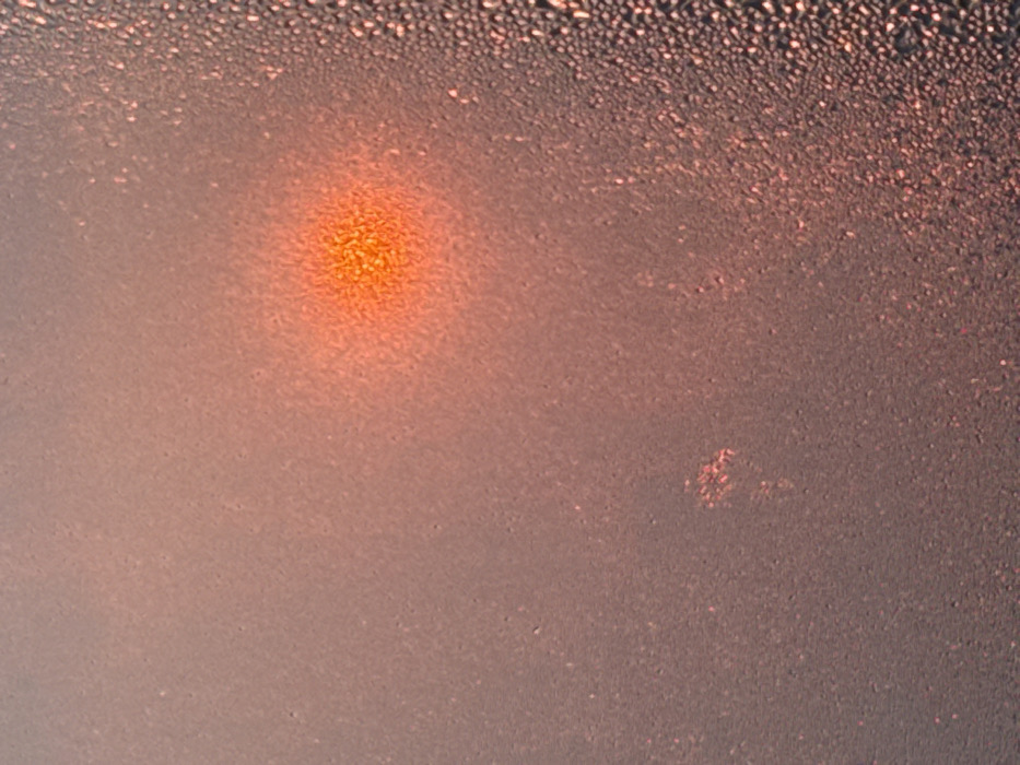 A close-up image reveals a textured surface, likely a window covered in condensation. At the center-left, a blurred orange sphere glows, resembling the sun seen through moisture. Smaller clusters of what appear to be larger water droplets are scattered toward the bottom-right. The entire scene has a reddish-brown hue, possibly from the light source. The condensed water creates a grainy effect, obscuring details behind the surface.