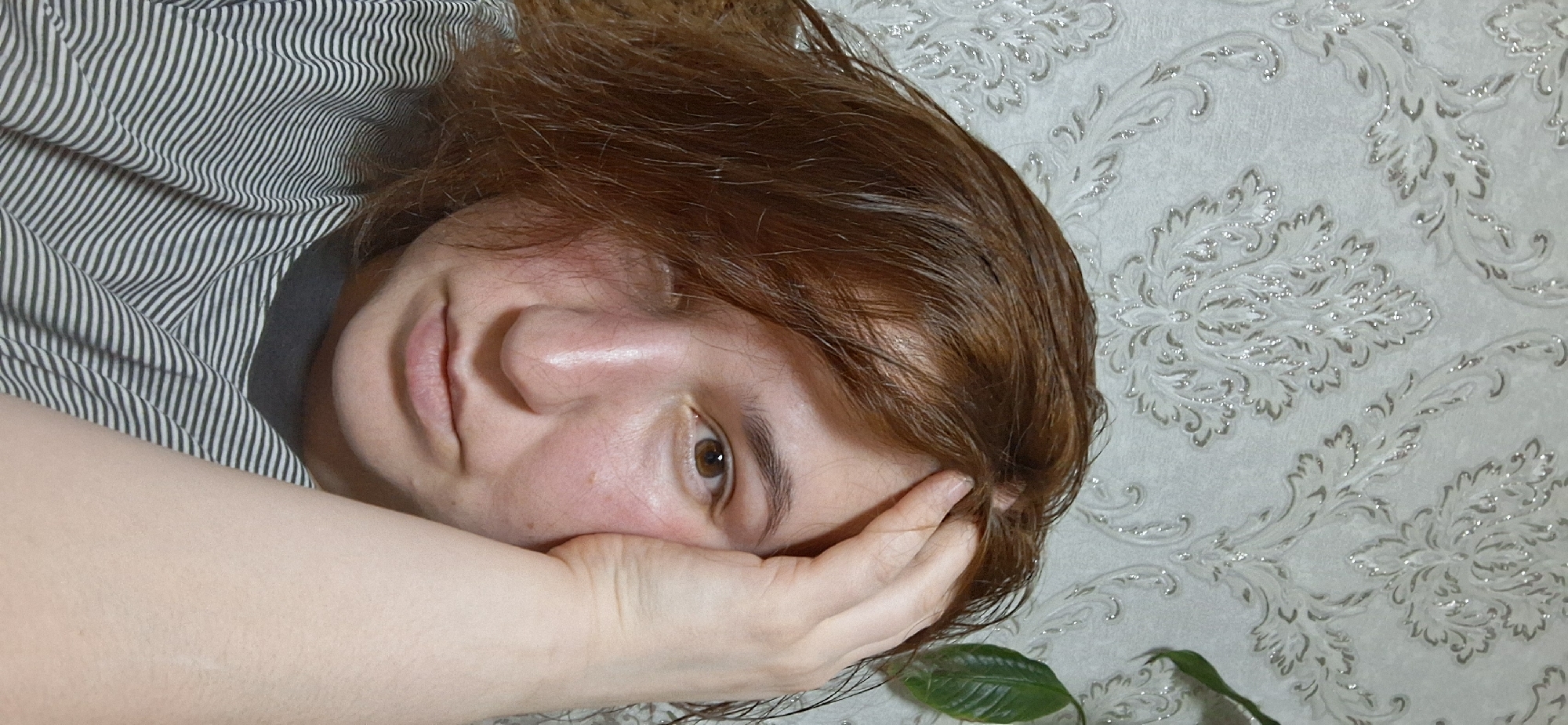 A person is lying down, appearing relaxed. The individual has light skin, reddish-brown hair, and a single visible brown eye. Their head rests on a hand, which is positioned near the side of their face. The person is wearing a gray and white striped top. The background consists of a light-colored wall with an ornate floral pattern. A glimpse of green foliage, likely from a plant, is visible near the person's hand. Based on the provided information, the location is in the city of Chaikovsky, Russia.