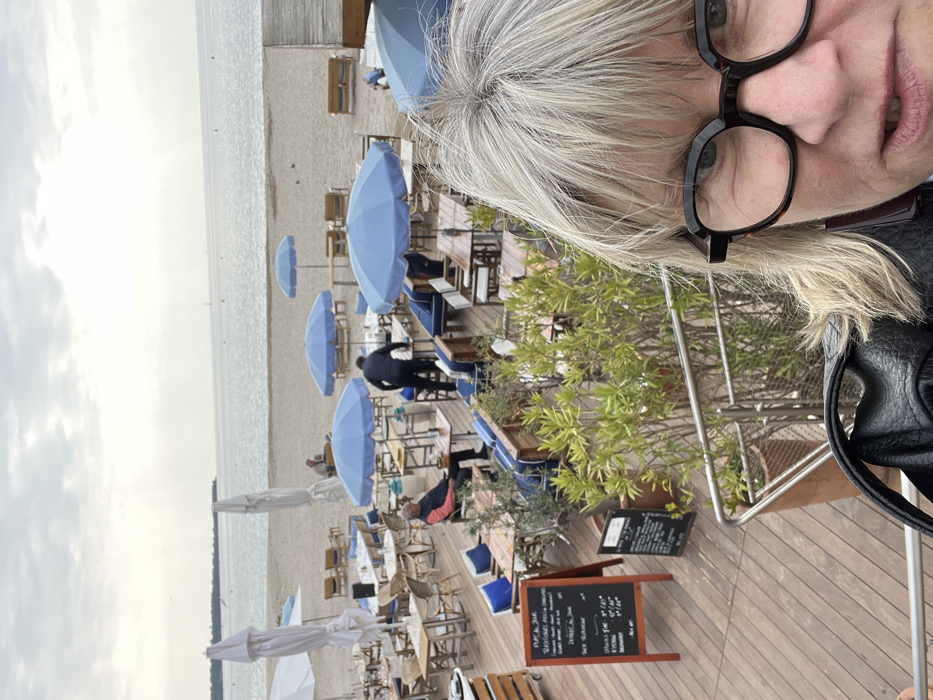 The image depicts an outdoor beachfront restaurant and lounge area, situated on a wooden deck platform overlooking a sandy beach and the sea, consistent with a location in Cannes, France. The sky is overcast. In the lower right foreground, a partial view of an adult female's face is present, captured in a selfie. She has shoulder-length, light blonde and grey hair with bangs and wears dark, multi-sided framed glasses. A black leather strap is visible over her left shoulder. The midground showcases the restaurant's outdoor seating arrangement. Numerous tables, both round and rectangular, are set with various chairs, some featuring blue cushions. Several open, circular blue umbrellas provide shade over seating areas, while two collapsed white umbrellas are also visible. Green leafy plants in terracotta planters are distributed across the wooden deck. Two dark chalkboards, serving as menus, are positioned on the left side of the deck; the larger board clearly displays "PLAT DU JOUR" and "ENTREE DU JOUR" along with prices in Euros. Three individuals are visible in the scene beyond the foreground subject. One man, dressed in dark attire, is standing and leaning over a table with blue-cushioned seating on the right, appearing to be arranging or clearing items. Another man is seated at a table on the left, wearing a light-colored top. A third, less distinct figure is seated under a white umbrella further back on the beach. The background features a wide expanse of light-colored sand, leading to the calm, grey-toned sea. Multiple buoys are visible on the water's surface, and faint silhouettes of distant vessels are present on the horizon. A low, distant landmass or treeline is discernible on the far left horizon.