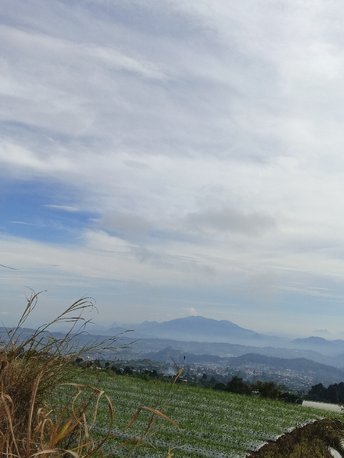 A verdant field dotted with rows of plants stretches towards a misty valley, where buildings nestle among rolling hills. A prominent mountain range rises in the background, its peaks softened by the atmospheric haze. Wispy clouds fill the sky, transitioning from a pale blue near the horizon to a more solid white expanse overhead. Dried grasses in the foreground add texture and depth to the landscape.