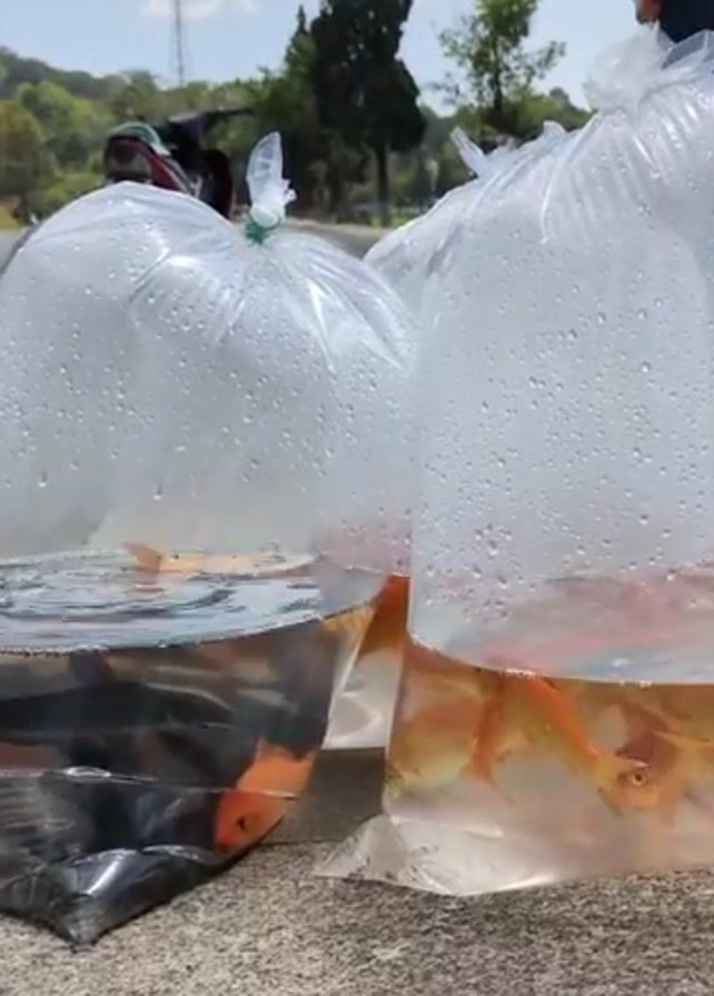 - "two large plastic bags filled with water and goldfish sitting on a sidewalk next to a road" by FM-MreoF3, licensed under CC BY 4.0