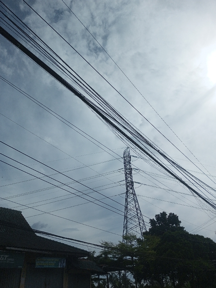 low-angle view of electrical wires and a utility pole against a cloudy sky. The wires stretch across the frame at a diagonal angle. A lattice-style utility pole is positioned behind the wires and amidst foliage. Part of a building with a sign is visible on the left side of the frame. The sky is overcast with the sun dimly illuminating parts of the clouds.