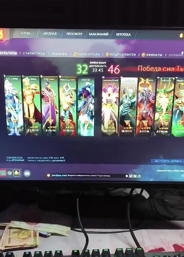 close-up view of a computer monitor displaying the results screen of a Dota 2 game. The screen shows the winning team and their individual statistics, with a focus on a character named "Soul" who had 10 kills, 9 deaths, and 11 assists. Below the monitor is a gaming keyboard with red backlighting and some cash. The room is dimly lit, and the video is slightly shaky.