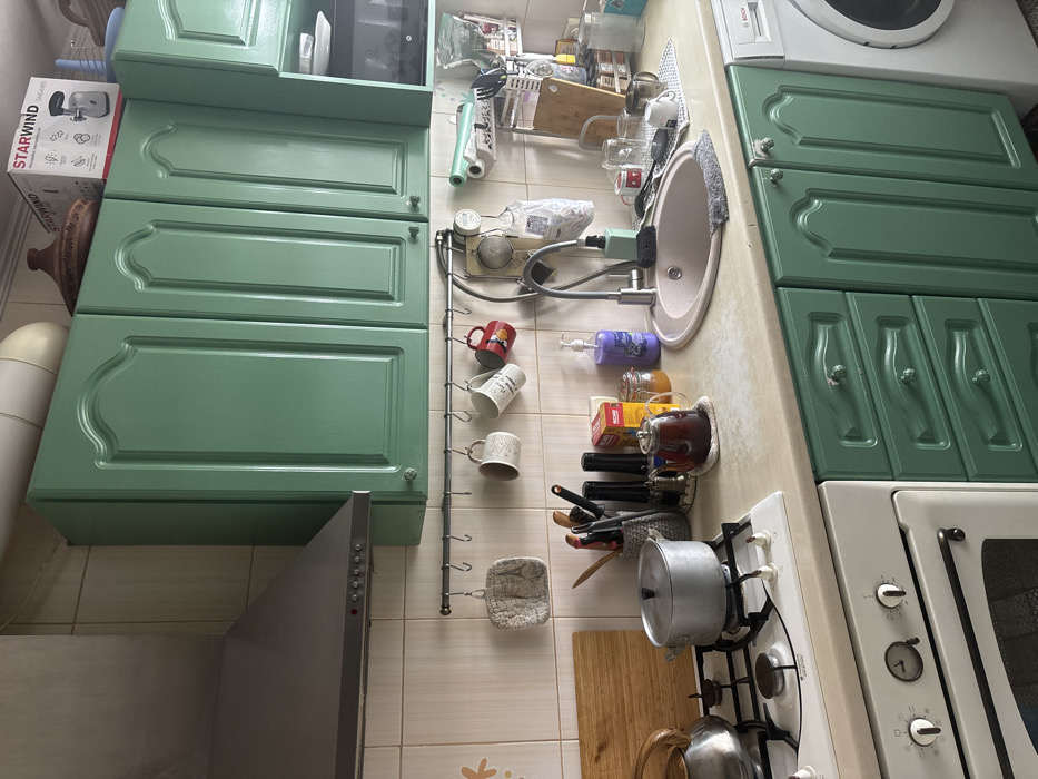 The image depicts an interior view of a residential kitchen. The room features a tiled backsplash with light, off-white square tiles and a subtle floral or abstract pattern on the left. Above the backsplash, wall-mounted kitchen cabinets with a distressed green finish and decorative paneling are installed, featuring dark, round knob handles. A stainless steel range hood with integrated controls is positioned above a white gas stovetop on the left. A large white ventilation pipe is visible running along the top of the wall above the cabinets. On top of the cabinets, a terracotta tagine pot and a "STARWIND" branded appliance box are stored. A microwave oven is integrated into the cabinetry on the far right. A metal rail with hooks is mounted on the backsplash, holding a light-colored potholder, multiple ceramic mugs (including one with a red interior and cartoon motif, and others with text), and various kitchen tools. The countertop is a light, possibly beige, speckled surface. On the left, a wooden cutting board leans against the wall behind the stovetop. A silver metal pot with a lid and a silver kettle with a wooden handle are placed on the gas stovetop. Below, a white oven with control knobs is visible. Adjacent to the stovetop, a container holds various kitchen utensils. A glass teapot filled with dark liquid sits on a crocheted coaster. Nearby, a yellow box (partially labeled in Cyrillic), a small glass jar containing a yellow substance, and other small containers are present. A purple liquid soap dispenser with Cyrillic text and a light blue pump bottle are positioned next to a light-colored, possibly composite, sink with a chrome gooseneck faucet. A grey sponge or cloth rests near the sink. To the right of the sink, a drying rack holds several clear glasses and mugs, with additional kitchen items and a wooden cutting board leaning behind them. The lower cabinetry matches the green, distressed style of the upper units, including a section of drawers with decorative handles. A white front-loading "BOSCH" washing machine is visible on the far right, partially obscured. No individuals are present in the scene. The image contains no verifiable visual information to confirm the specified location of Rostov-on-Don, Russia.