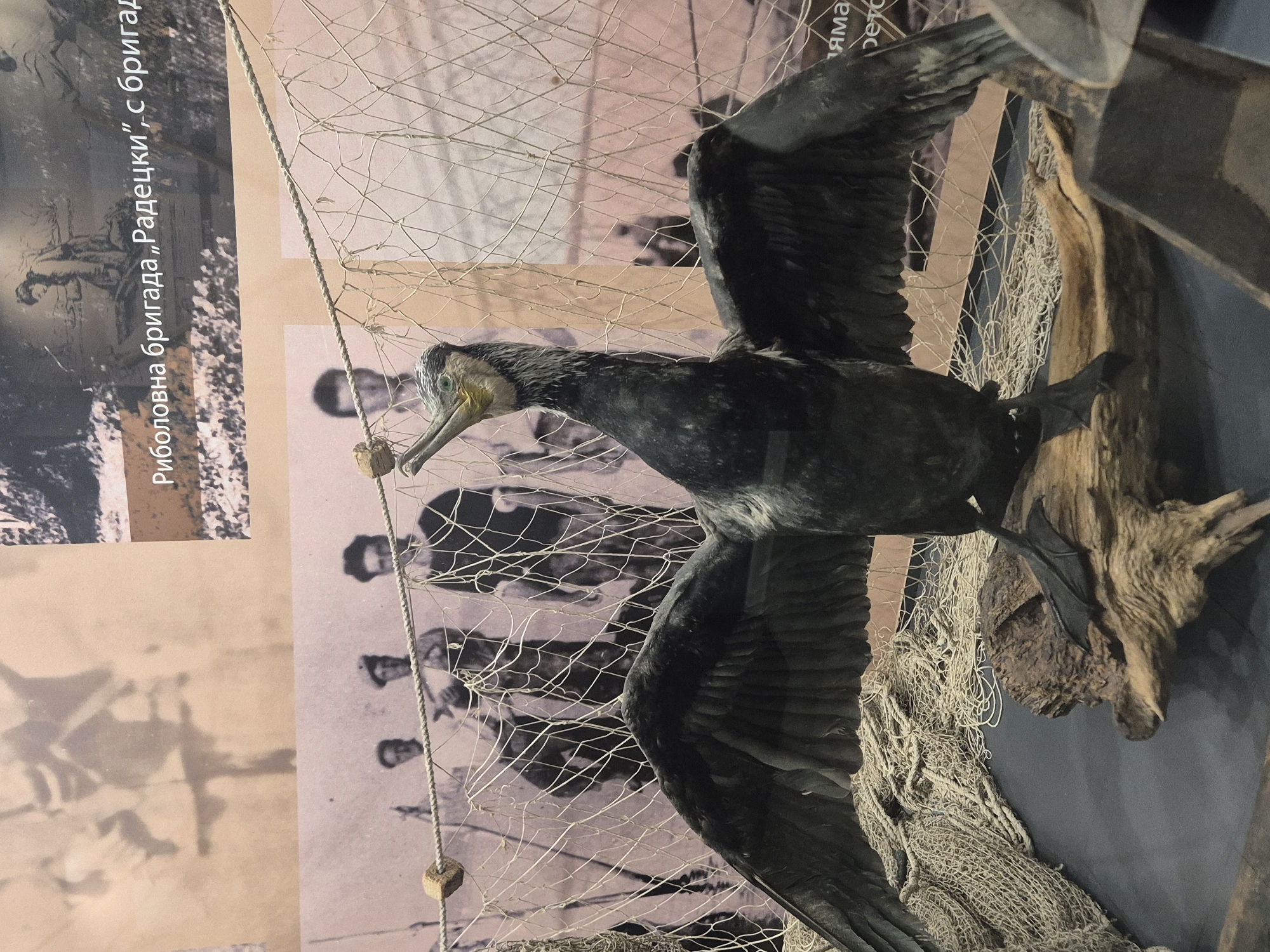 The image depicts a taxidermied cormorant mounted on a piece of driftwood, positioned in front of a backdrop that includes fishing nets and historical photos related to the fishing industry. The background photos appear to be sepia-toned and show groups of fishermen. The text on the left side reads "Риболовна бригада Радецки с бригада". Based on the information provided, this scene is likely located in a museum or exhibit in the city of Tutrakan, Bulgaria, related to the history of fishing. The cormorant is displayed in a way that suggests it is caught in a fishing net, adding to the thematic presentation.