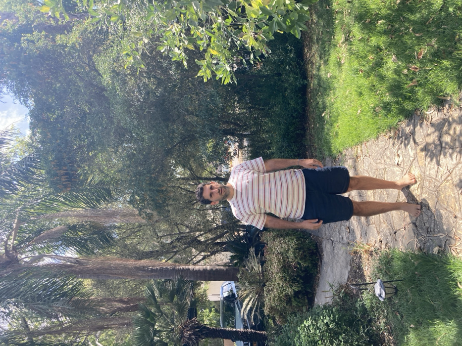 The image depicts a male subject standing barefoot on a light-colored, irregularly paved stone pathway in an outdoor, heavily vegetated area, identified as the Megido Regional Council, Israel. The man, with dark hair and stubble, appears to be in his 30s or 40s, wearing a short-sleeved, horizontally striped t-shirt (cream with thin red stripes) and dark blue shorts. He stands facing the viewer with a neutral expression, his arms resting at his sides. The pathway separates a well-maintained grassy lawn on the right from a dense planting of shrubs and smaller plants on the left. A small, black solar-powered garden light with a white dome is positioned on the grass immediately to the left of the pathway in the foreground. The background is characterized by abundant green foliage, including several tall palm trees with visible fronds, particularly on the left side. Other deciduous and evergreen trees contribute to the dense arboreal backdrop. Partially visible behind the foliage on the far left is a dark-colored SUV, suggesting a nearby road or driveway. The scene is illuminated by strong sunlight, casting distinct shadows on the pathway, indicating clear weather.