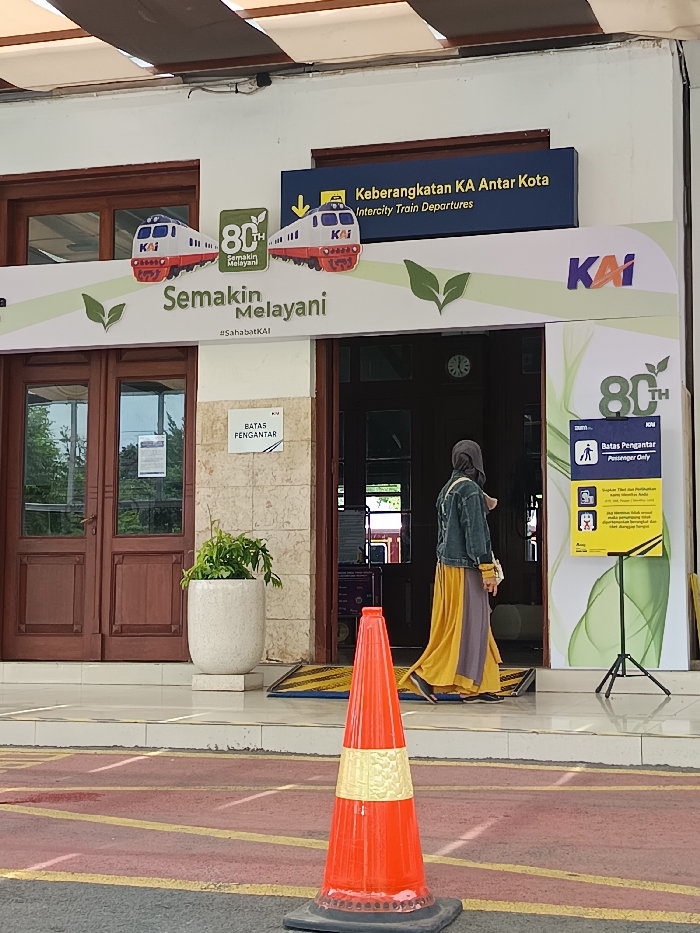 The image depicts the entrance area of Jember Train Station in Jember, Indonesia. One individual, seen from behind, is walking forward, entering the station. This person wears a dark headscarf, a blue denim jacket over a long-sleeved garment, and a long, pleated skirt in shades of yellow and grey, carrying a light-colored shoulder bag. The station building features a white facade with an open central entrance and brown wooden double doors to the left. Above the central entrance, a prominent blue sign reads "Keberangkatan KA Antar Kota" (Intercity Train Departures) in Indonesian and English, accompanied by a downward arrow and a train icon. Below this, a white banner spans the entrance, displaying "Semakin Melayani" (Getting better at serving), the KAI (Kereta Api Indonesia) logo, and "80TH" anniversary branding with two stylized KAI locomotives and green leaf motifs. To the left of the central entrance, a white sign on a stone-textured wall section states "BATAS PENGANTAR" (Drop-off Limit). Below this, a large, white cylindrical planter contains green foliage. At the entrance threshold, a yellow and black striped mat is visible. Inside the station, above the entrance, a circular clock face is discernable. To the right of the central entrance, a black-framed sign on a tripod stand displays "BATAS PENGANTAR" / "Passenger Only" along with additional text and icons relating to ticket requirements, valid identification, and health protocols. In the foreground, an orange traffic cone with a yellow reflective band and a black base stands on red ground marked with yellow lines.