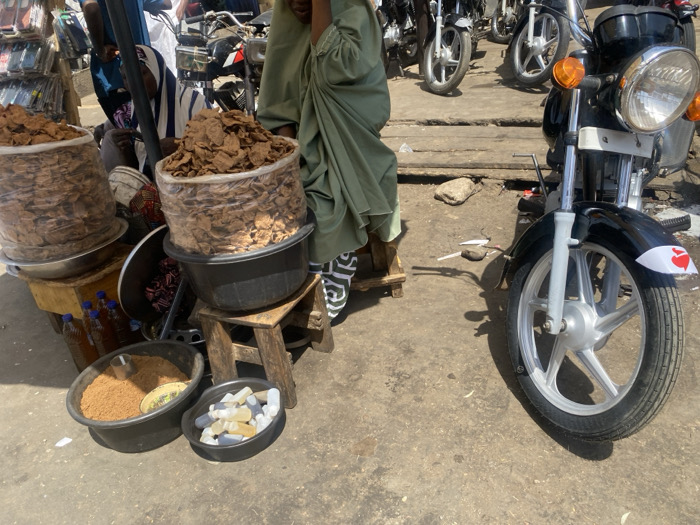 This image depicts an outdoor market scene in Maiburiji, Nigeria, under bright sunlight. In the foreground, a vendor's stall displays various goods. Two large clear plastic bags filled with light brown, flake-like food items (possibly fried dough or snacks) sit atop metal bowls, which rest on wooden stools. Below these, a black plastic basin contains red, dried hibiscus flowers (zobo leaves). On the ground, two black plastic bowls are visible: one holds a pile of light brown, granular substance with a small scoop, and the other contains multiple small, elongated tubes or containers filled with clear, white, and yellowish substances, possibly perfumes or oils. Several small brown bottles are also visible near the base of the stall. A person, likely the vendor, is partially visible seated behind the goods, wearing a green garment and possibly adjusting their headwear with their right hand. Another person, wearing a white and blue striped head covering, is partially visible in the mid-ground, seated further back. To the right, the front section of a black motorcycle is prominently visible, featuring a large chrome-rimmed headlight, amber turn signals, and a silver five-spoke front wheel. Its black fender has a white sticker with a red heart-shaped symbol. In the background, multiple other motorcycles are parked on what appears to be an elevated, uneven dirt and wood surface. To the far left, a display rack with numerous smartphone cases hangs vertically. The ground throughout the scene is rough, uneven dirt with some scattered debris and shadows cast by the sun.