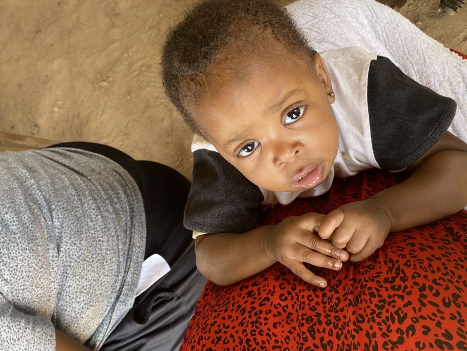 The image depicts a young child, likely an infant or toddler, with dark skin, dark eyes, and short curly hair, looking directly into the camera