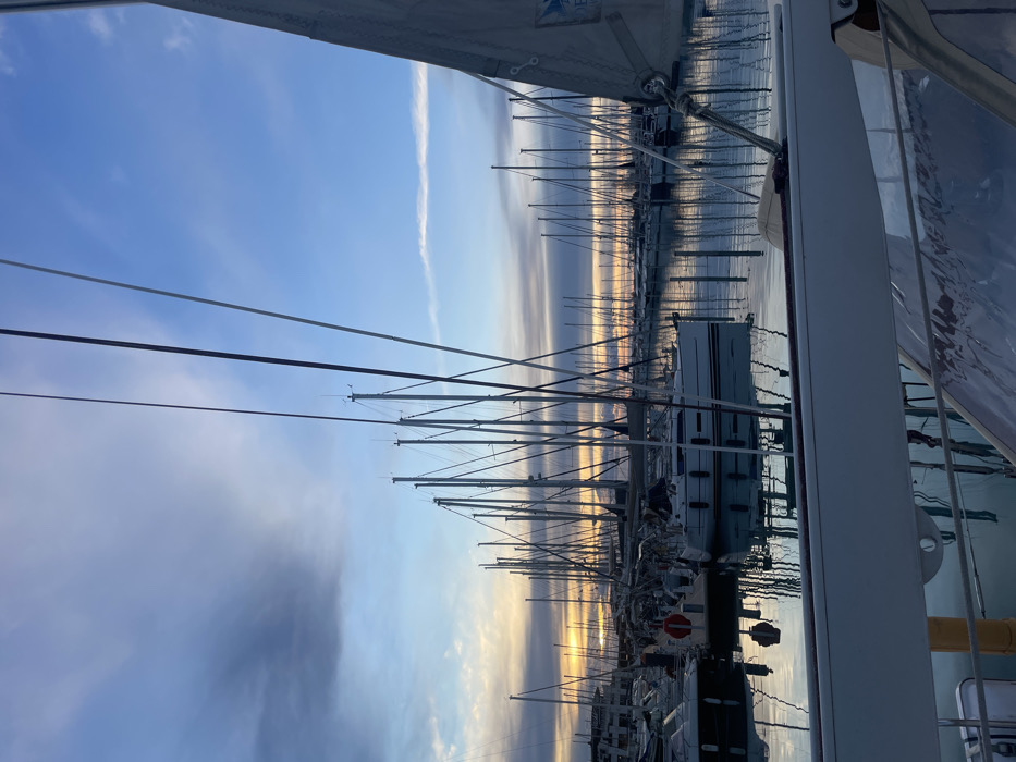 The image depicts a marina in La Grande-Motte, France, observed during twilight conditions, indicated by a low sun on the horizon. The viewpoint is from the deck of a vessel, with its white boom, rigging lines, and a section of a greyish-white sail, featuring a blue emblem, visible in the foreground and extending upwards on the right side. The marina is densely populated with numerous sailboats, uniformly docked in the calm, reflective water. Their masts and rigging form a prominent series of vertical and diagonal lines across the middle ground and background. The sky transitions from a clear blue overhead to areas of scattered grey and purple clouds, with a distinct band of orange and yellow light visible at the horizon line. The still water accurately mirrors the boats, masts, and sky above. In the mid-ground, a white-hulled sailboat is clearly identifiable, displaying a red circular lifebuoy attached to its stern. No individuals are visible within the scene, and all vessels appear stationary.