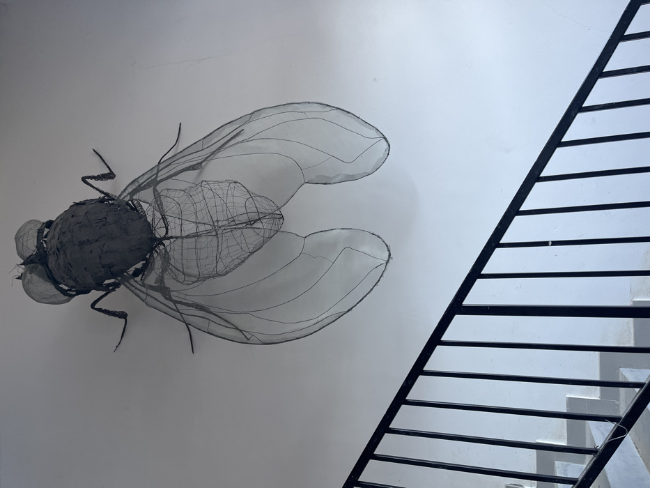 An indoor scene in Cetinje, Montenegro, displays a large-scale sculpture of a fly mounted on a plain white wall