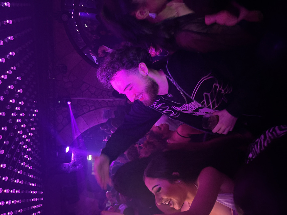 A nightclub scene bathed in purple light. A man with curly hair and a beard, wearing a black patterned jacket, smiles and reaches out with his right hand. He holds a glass in his left. Below him, a woman with long dark hair smiles. Other faces and figures appear blurred in the background, suggesting a crowded atmosphere. A wall with rows of purple lights is visible to the left. The nightclub setting features decorative stone arches and ceiling elements.