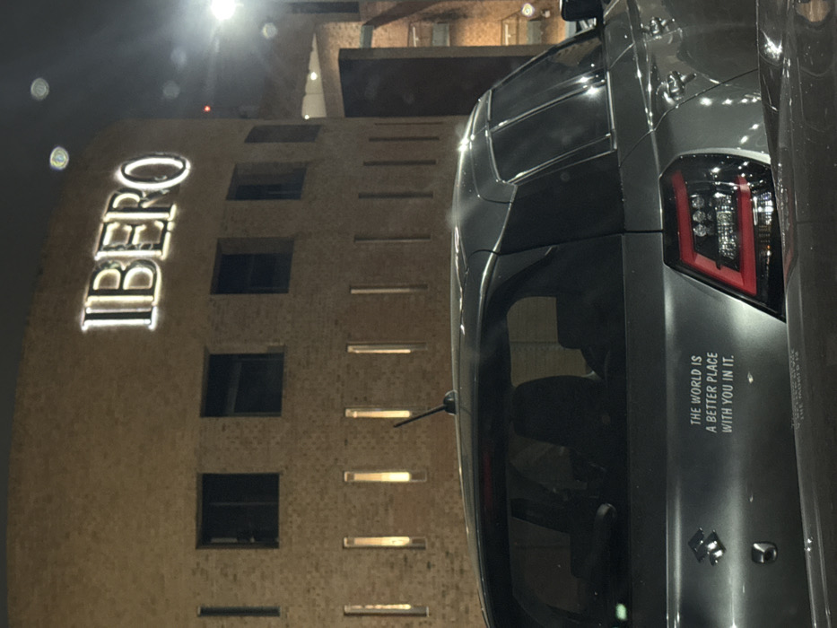 A nighttime, static scene depicts the rear of a gray hatchback vehicle, likely a Suzuki, in the foreground. A white decal on the vehicle's rear hatch reads, "THE WORLD IS A BETTER PLACE WITH YOU IN IT." The vehicle is positioned before a large, multi-story building constructed of light brown brick, featuring rectangular windows and illuminated vertical fenestrations. The building's upper facade displays a prominent, illuminated sign spelling "IBERO." This identifies the location as Universidad Iberoamericana (IBERO) in Santa Fe, Álvaro Obregón, Mexico City. The environment is artificially lit, with no individuals visible.