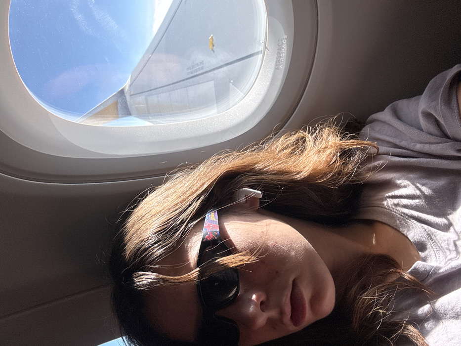 The image depicts a person seated within an airplane cabin, positioned next to an oval-shaped window during daylight. The individual, appearing to be female with medium-length brown hair, is wearing dark rectangular sunglasses with colorful patterned temples and a white wireless earbud in her visible right ear. She wears a light-colored t-shirt. Direct sunlight enters through the window, illuminating her hair, the left side of her face, and casting shadows on her clothing and the right side of her face. Through the window, a portion of the aircraft's wing is visible against a clear blue sky with some white clouds below, indicating the plane is in flight at cruising altitude. The word "AIRSPACE" is faintly discernible on the lower window frame. The visual evidence indicates the scene is aboard an aircraft during flight, rather than in a city. Therefore, the specified location of Unknown, Israel, is incompatible with the depicted environment.