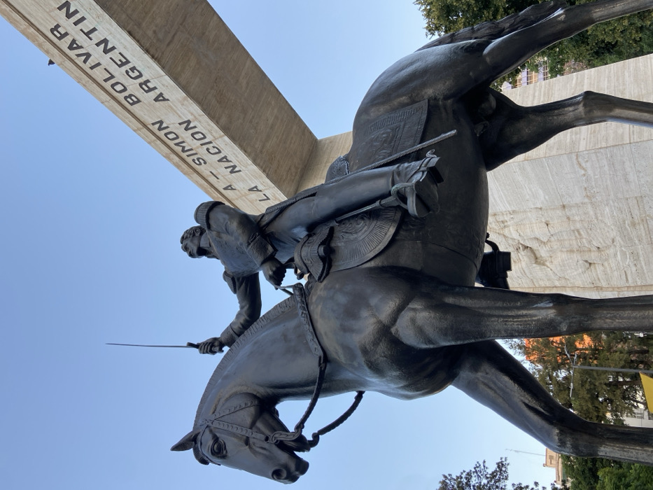 The image depicts a bronze equestrian statue of Simón Bolívar