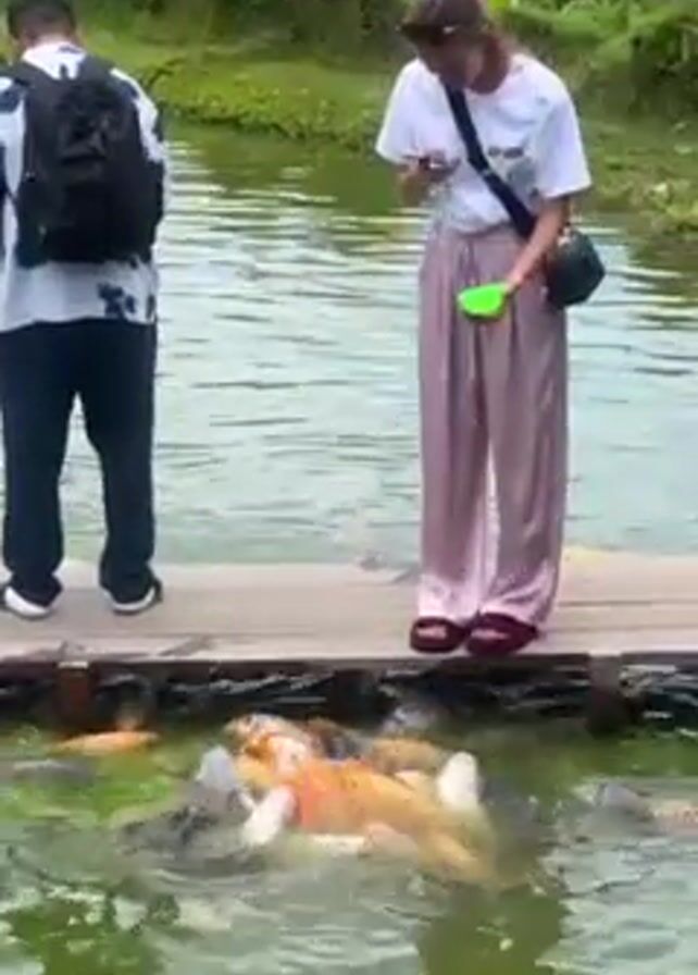 A young woman in sunglasses, a white t-shirt, and pink satin pants stands on a wooden dock, feeding koi fish in a pond. She holds a small green container, presumably filled with food, and tosses it into the water. The fish gather in a frenzy, their orange and white colors creating a striking contrast against the green water. A man with a backpack stands beside her, observing the scene. The pond is surrounded by lush greenery and yellow flowers. Another person can be seen in the background, near the flowers. The scene is captured in a bright, daytime setting.