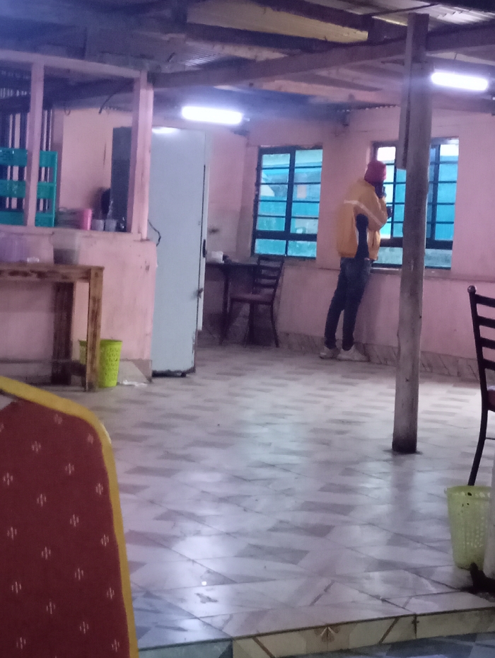 The image displays the interior of a room in Mosop ward, Kenya, characterized by light pink walls and a floor tiled with a light and dark grey geometric pattern. The ceiling features exposed wooden beams and corrugated metal sheets, illuminated by overhead fluorescent tube lights. One individual is visible on the right side of the frame, standing near a window with blue-tinted panes and dark frames. This person is wearing a yellow jacket, dark trousers, and a red beanie, and is holding a dark object, likely a mobile phone, to their face. On the left, a light-colored wooden table is present, with a light green plastic waste bin positioned beneath it. Behind this table, a counter area holds several blue/green plastic crates and various containers. A tall, white, narrow appliance, resembling a refrigerator or cabinet, stands centrally, separating sections of the room. Further right, a dark wooden table with a matching chair is positioned near another window. A vertical wooden pillar extends from the floor to the ceiling in the mid-right. A chair with a red patterned cushion is partially visible in the foreground, bottom left, and a dark-colored slatted chair is partially visible on the far right, near a second light green plastic waste bin.