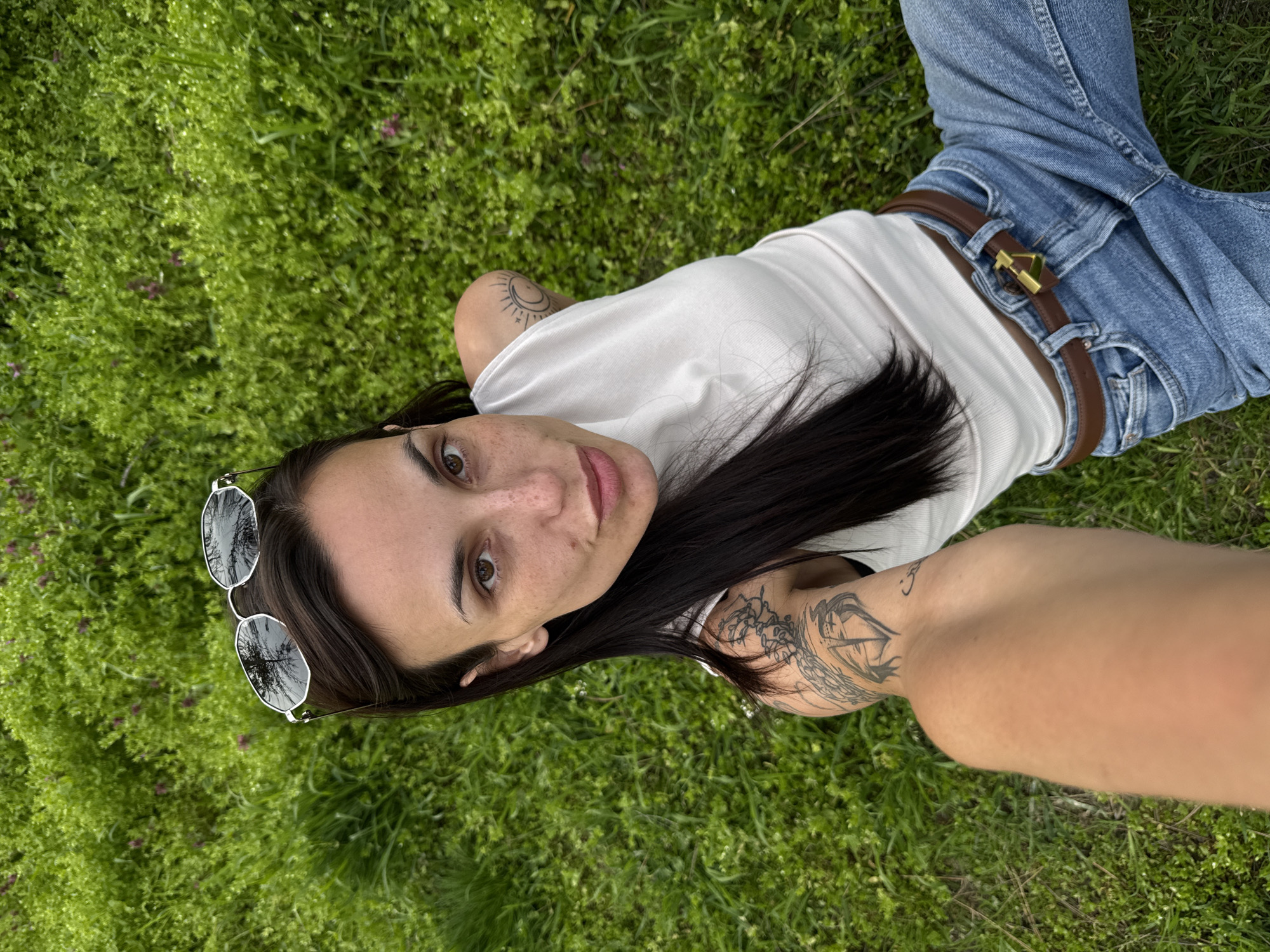 A woman lies on her back in grassy terrain, viewed from an overhead perspective. She is wearing blue jeans with a brown belt and a white top. Sunglasses are placed near her face. Her dark hair is loose and spread out on the grass. Tattoos are visible on both arms. The environment appears to be a grassy area with small flowers interspersed. There are no identifiable markers to confirm if this is Obnova, Bulgaria.