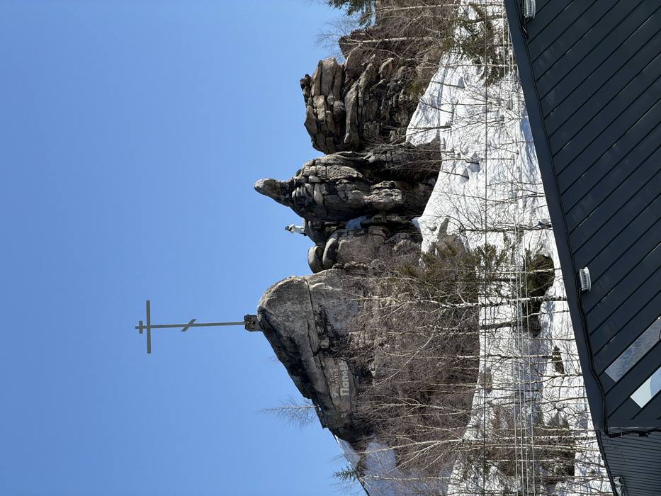 This image depicts a winter or early spring scene in Gubakha, Russia, centered on a rocky hillside under a clear blue sky. The prominent features include: 1. **Sky:** A vast, uninterrupted expanse of clear, bright blue sky dominates the upper half of the frame. 2. **Rock Formations:** A series of large, grey-to-dark-grey rock formations rise from a snow-covered slope in the mid-ground. The leftmost formation is a substantial, lighter grey outcrop supporting a tall, metallic, three-barred Russian Orthodox cross at its apex. Faint Cyrillic text, including the word "ПОЛОВЫ", is visible painted on the side of this rock. To the right, on a slightly lower, darker rocky section, a lone figure stands. Further right, additional dark, rugged rock formations display distinct vertical and horizontal fracturing. 3. **Figure:** A single individual, dressed in light-colored (predominantly white) outerwear with a covered head, stands on a rocky ledge, facing towards the right side of the frame. 4. **Vegetation and Snow:** The slopes below and surrounding the rock formations are covered in white snow. Numerous bare deciduous trees with slender trunks and branches are scattered across these snowy areas, interspersed with a few darker evergreen conifers. 5. **Infrastructure:** Several thin, horizontal wires are visible stretching across the mid-lower section of the image, passing through the bare trees. 6. **Foreground Structure:** The lower portion of the image is occupied by the dark grey, sloped roof of a modern building, constructed with horizontal ribbed metal panels. Small, white circular vents or fixtures are visible along the roofline. A section of a dark grey, vertically paneled wall with a reflective, rectangular window or panel is present on the lower left.