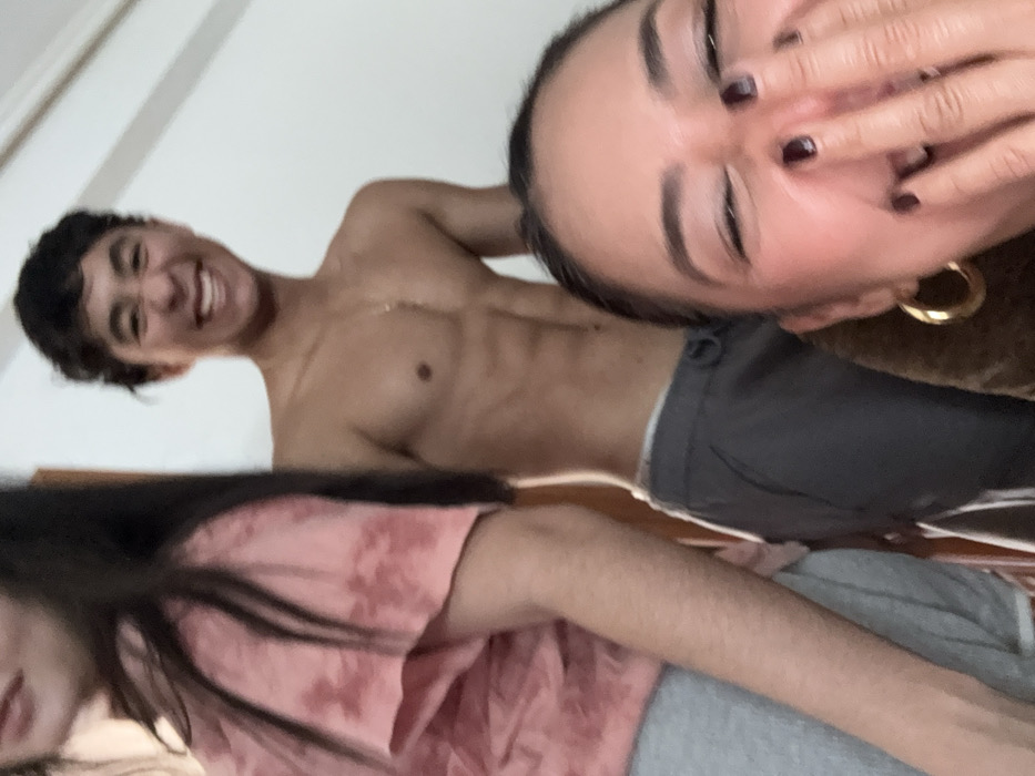 Three individuals are captured in a candid shot. A young man with a bright smile, showcasing a toned torso, is positioned in the background wearing grey trousers. To the left stands a woman in a pink tie-dye shirt and grey bottoms. A second woman is close to the camera, wearing large hoop earrings with her hand covering her face, and a cheerful expression. The image has a casual and informal feel.