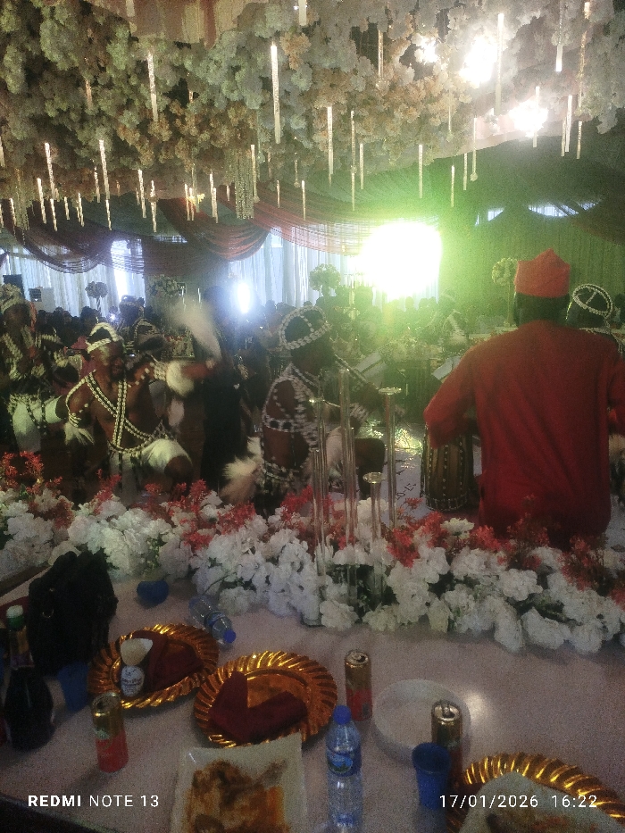 A festive indoor gathering features men in traditional attire, some adorned with beaded necklaces and headdresses, engaged in drumming and dance. The scene is bright, illuminated by overhead lights amidst floral decorations. A table in the foreground holds refreshments, including plates, bottles, and drinks, suggesting a celebratory event, possibly a wedding, given the presence of traditional performers and the decorated setting.