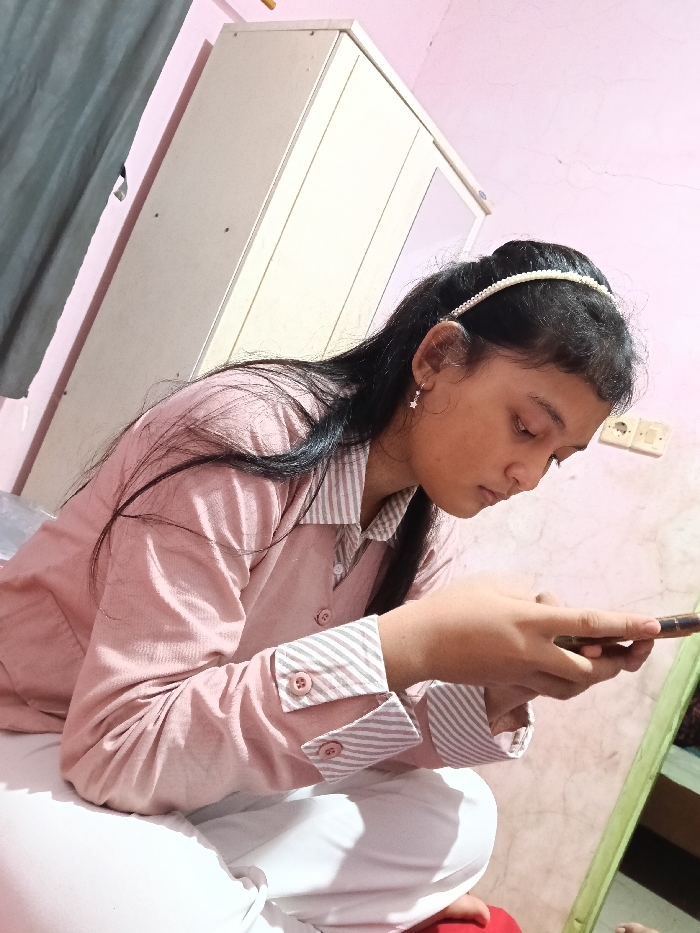 A young female subject is depicted indoors in Gunem, Indonesia. She is seated, wearing a light pink long-sleeved shirt with a striped collar and striped cuffs featuring pink buttons, and white bottoms. Her long dark hair is adorned with a white pearl headband, and she has small star-shaped earrings. Her gaze is directed downwards towards a black smartphone she holds horizontally with both hands. The immediate background consists of a pale pink wall. To the upper left, a dark grey curtain is partially visible. In the upper right quadrant, a light-colored, possibly off-white, two-door wardrobe with a mirrored panel on the right door stands against the wall. Below the wardrobe, two white electrical outlets are mounted on the pink wall. A reddish surface is partially visible beneath the subject's legs.