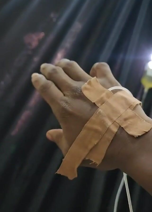 human hand with tan-colored medical tape secured over what appears to be an IV catheter. The IV line is connected to a bag of yellow fluid suspended in the air against a black curtain with subtle red patterns. The lighting in the room appears dim, with a bright highlight on the IV bag.